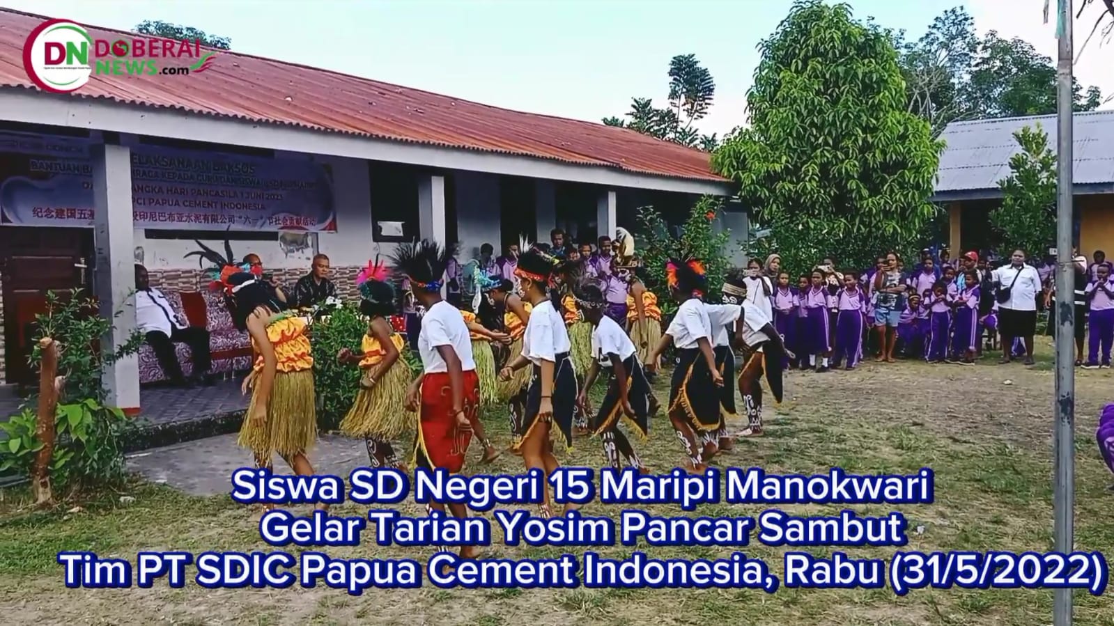 Para siswa menyanyikan lagu Kebangsaan Indonesia Raya dan menggelar Tarian Yosim Pancar memperlihatkan tarian budaya ciri khas Papua kepada dua petinggi Perusahan PT SDIC Papua Cement Indonesia yang berkebangsaan Cina.