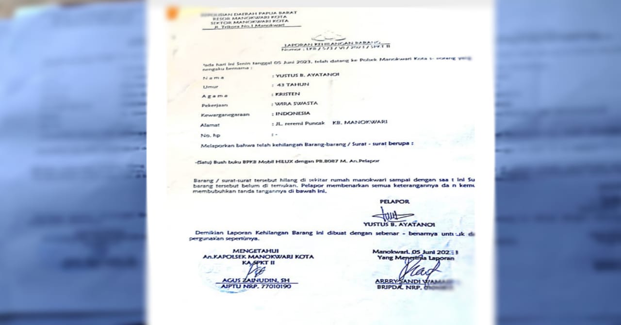 Atas dasar tersebut, Yustus telah membuat laporan kehilangan di Kepolisian Sektor (Polsekta) Manokwari Kota dengan nomor registrasi LKB/573/VI/2023/SPKT.II tertanggal 5 Juni 2023.