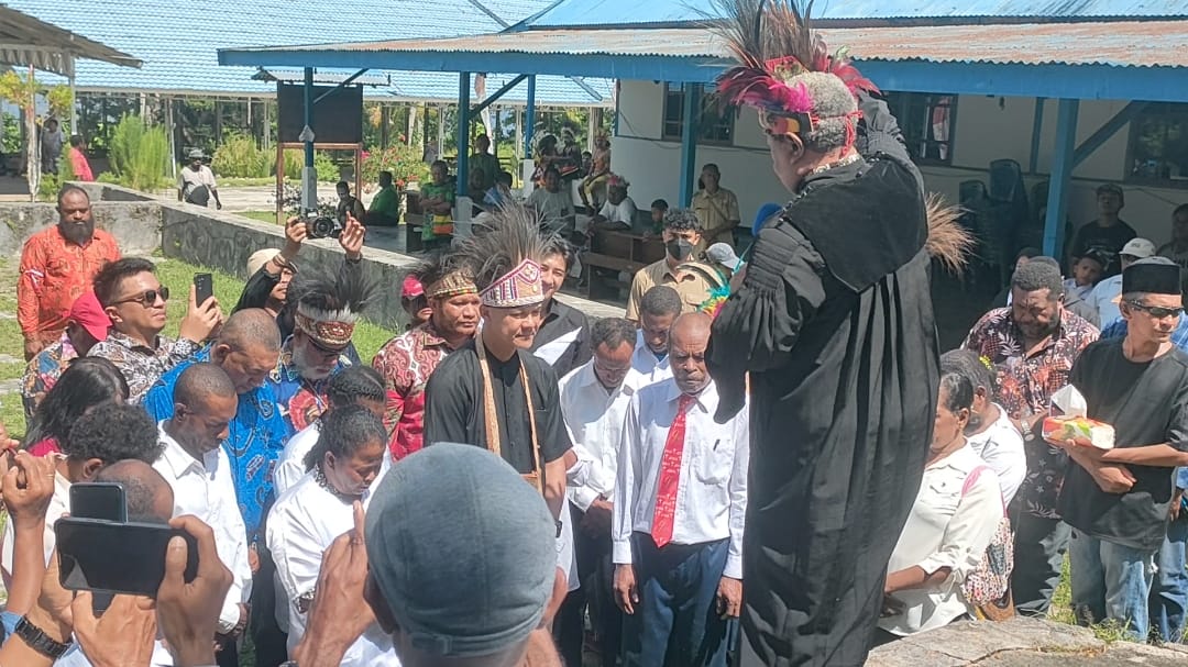 Pendeta Hans Wanma, selaku Ketua Jemaat Gereja GKI Laharoi yang juga merupakan tokoh agama di Tanah Papua ini menyambut Ganjar diiringi dengan tarian adat.