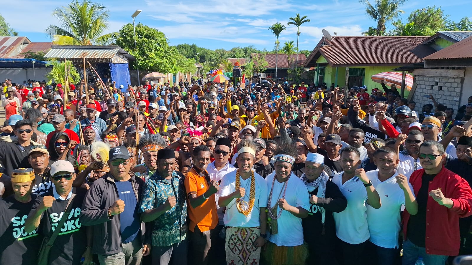 Terpantau, Ribuan massa pendukung memadati sejumlah ruas jalan poros SP 3 Manimeri, dengan kerelaan hatinya dan tanpa paksaan untuk menjemput pasangan bakal calon bupati dan wakil bupati Kabupaten Teluk Bintuni periode 2024-2029, Yohanis Manibuy – Joko Lingara usai menerima sejumlah rekomendasi dari DPP Partai di Jakarta.