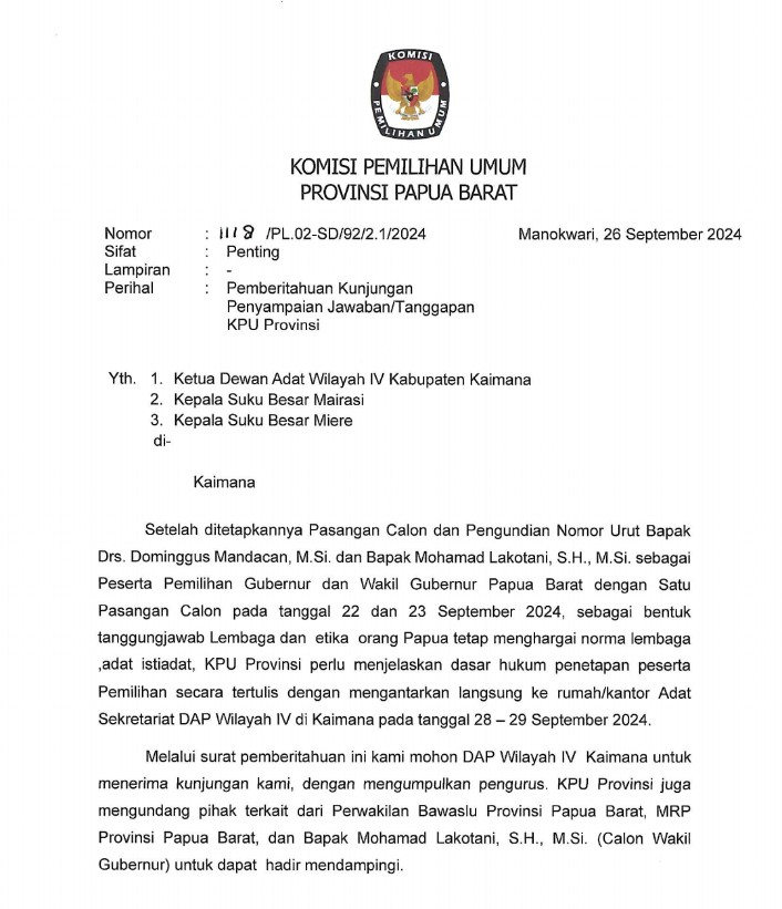 Manokwari, doberainews – Suku Besar Mairasi menolak undangan klarifikasi yang layangkan dari KPU Papua Barat, melalui surat nomor KPU nomor 1118/PL.02-SD/92/2.1/2024 tentang Pemberitahuan penyampaian jawaban/tanggapan KPU Provinsi Papua Barat, yang ditujukan kepada Ketua Dewan Adat Wilayah IV Kabupaten Kaimana, Kepala Suku Mairasi dan Kepala Suku Miere tertanggal 26 September 2024.