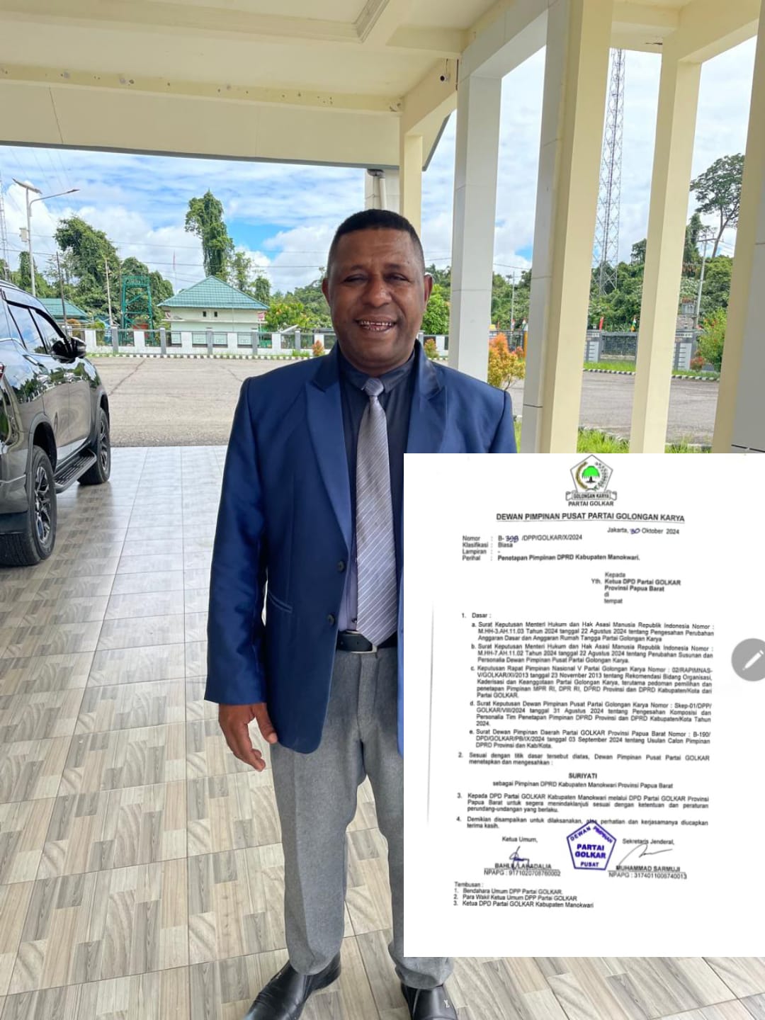 Manokwari, doberainews – Papua Barat – Berdasarkan hasil pemilihan anggota DPRD Kabupaten Manokwari tahun 2024, Suryati berhasil memperoleh suara terbanyak dengan total 2.442 suara. Sejalan dengan hasil tersebut, Dewan Pimpinan Pusat (DPP) Partai Golkar mengeluarkan surat penetapan Nomor B-398/DPP/GOLKAR/X/2024 tertanggal 30 Oktober 2024, yang ditandatangani oleh Ketua Umum Partai Golkar, yang menugaskan Suryati untuk menjabat sebagai Wakil Ketua DPRD Kabupaten Manokwari.