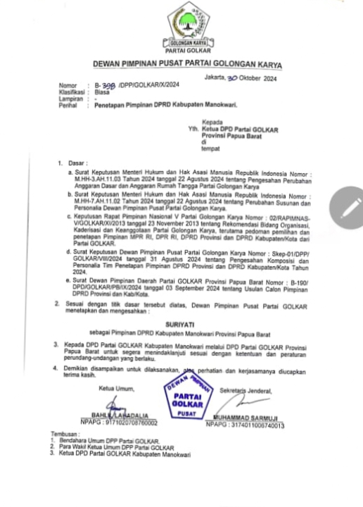 Surat Keputusan DPP Golkar atas penunjukan Suryati sebagai Wakil Ketua I DPRD Kabupaten Manokwari periode 2024 – 2029