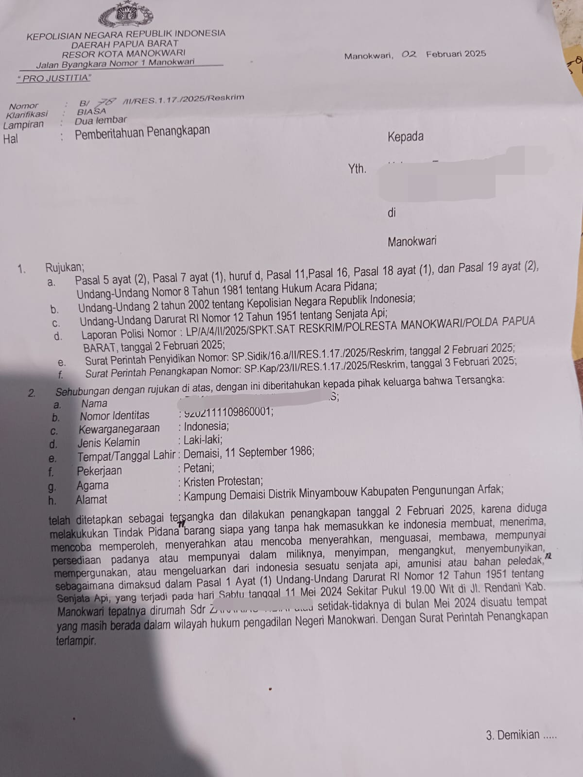 Tanggal, 02 Februari 2025, jam 04.00 Wit, Penyidik Polresta Manokwari menggerebek rumah Saudara ZT di Rendani dan menangkap ZT, bersama 2 (dua) orang saudaranya Hosea Bikyouw dan Yusak Tibiai yang turun ke Manokwari dengan maksud untuk belanja barang dagangan pada Kios-nya di pegunungan Arfak, namun ikut tertangkap dengan tuduhan merekalah yang melakukan Penembakan terhadap Advokat Yan Warinussy, SH.