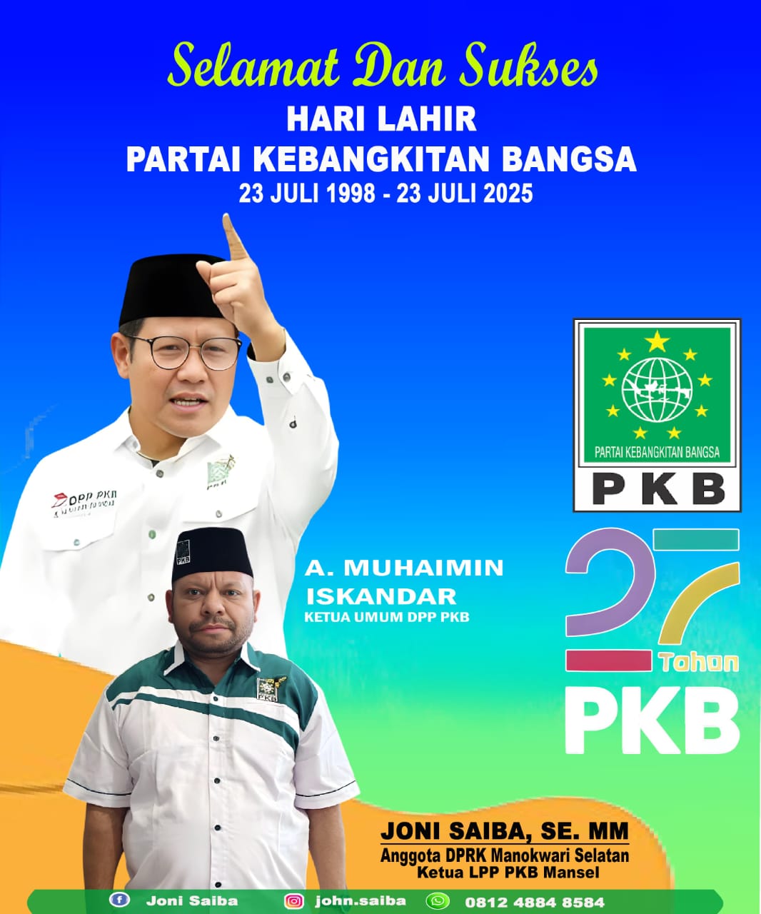 Mansel, doberainews – Kader Partai PKB Kabupaten Manokwari Selatan mengucapakan selamat dan Sukses atas hari lahir Partai Kebangkitan Bangsa (PKB) ke 27 Tahun pada 23 Juli 2025.